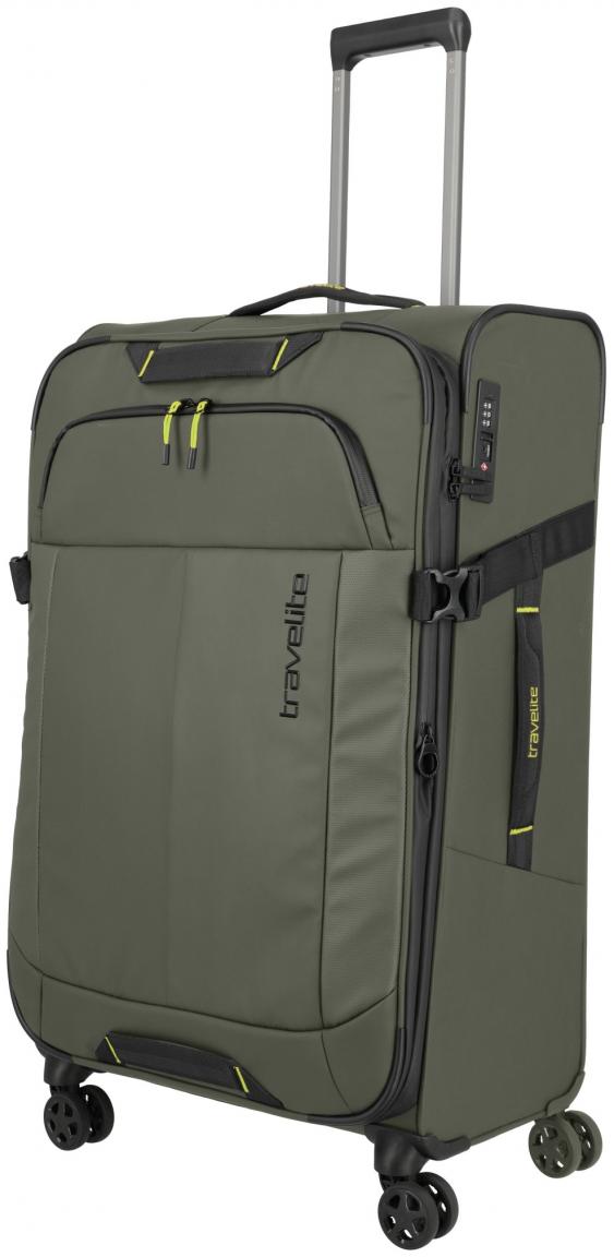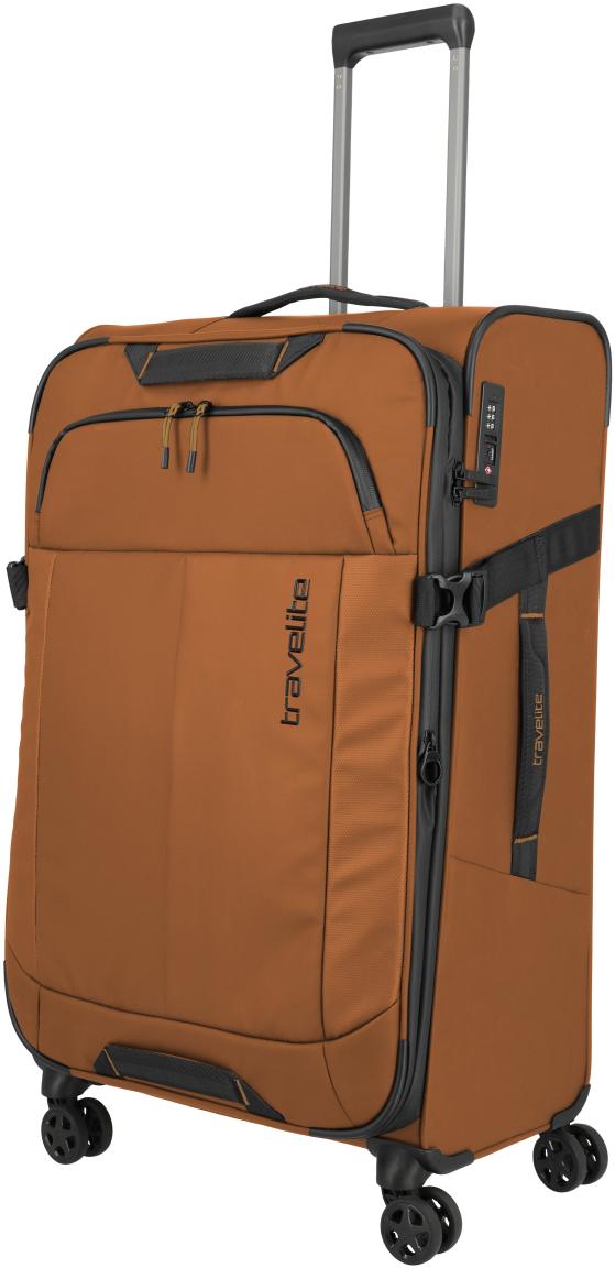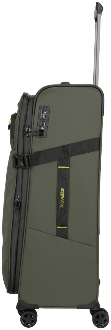 Mittels seitlicher Gurte kann der Rollenkoffer ein wenig komprimiert werden. Eine Dehnfalte ermöglicht eine Erweiterung des Koffers um 4cm, wodurch sich das Volumen um etwa 5 Liter erhöht.